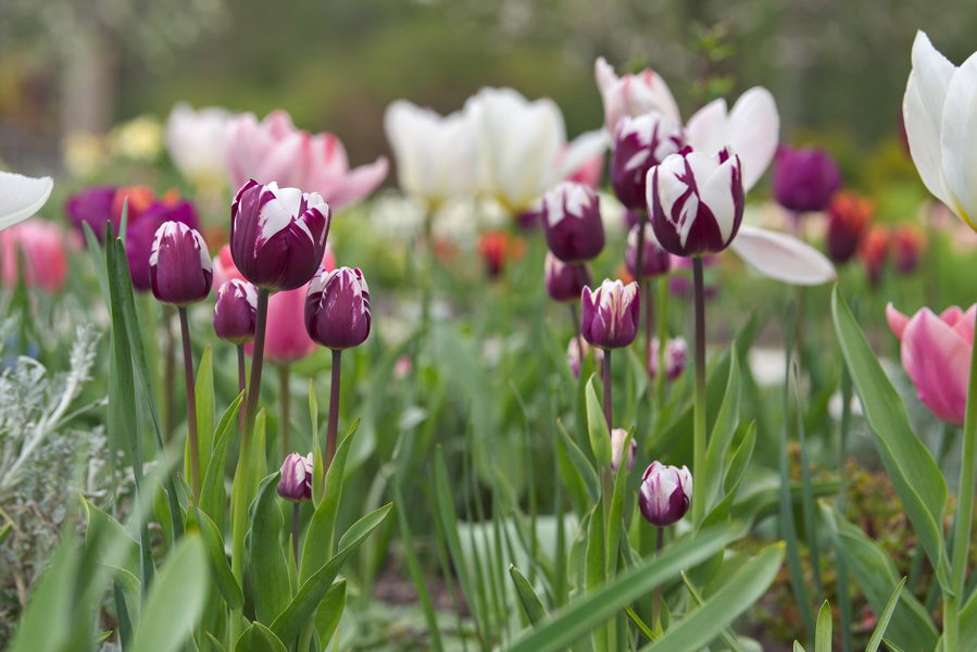 - Garten Verschuur, Tulpe 'Purissima', Tulpe 'Purple Rain', Tulpe 'Rem's Favourite', Garten Les Deesses Vertes