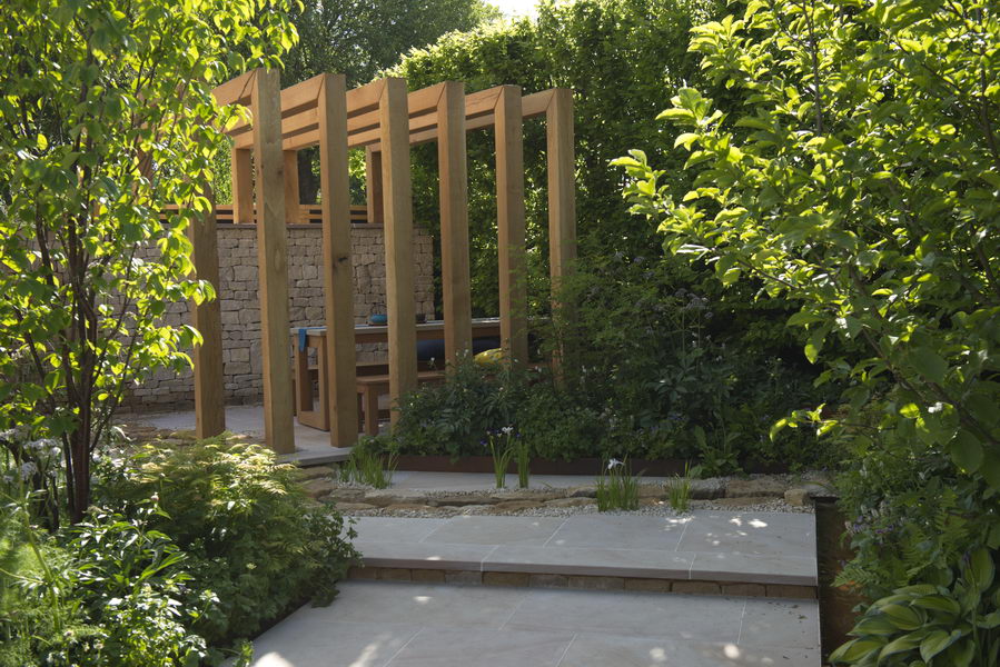 - Chelsea Flower Show, kleiner Garten, Pergloa, Valeriana officinalis, Wasserrinne