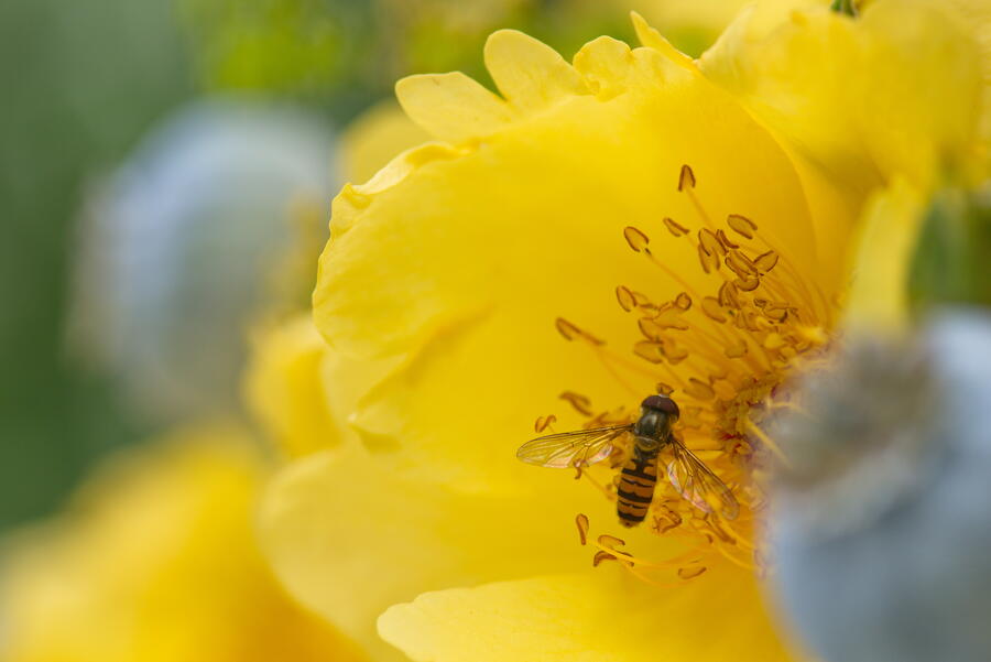 - Beetrose, Insekt, Rose 'Lemon Fizz', Schwebfliege