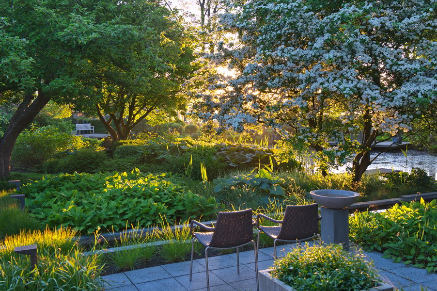 - Crataegus, Sitzplatz, Teich, Wasserrinne, Weißdorn, modern, Persicaria amplexicaulis