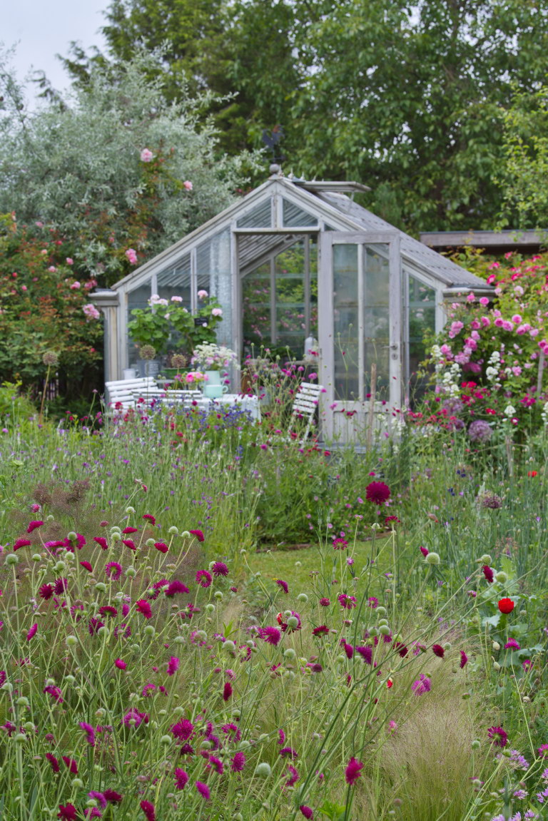 - Gartenhaus, Gewächshaus, Ramblerrose 'Albertine', Rose 'Harlow Carr', Knautia macedonia