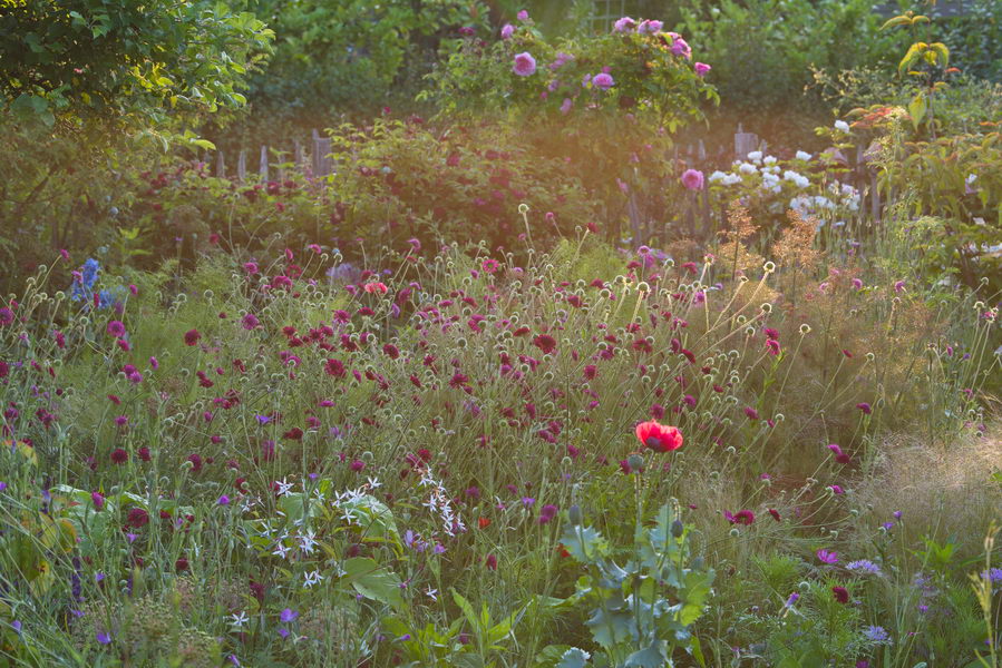 Knautia macedonia, Rose 'Gertrude Jekyll', Rose 'Tuscany', Papaver somniferum