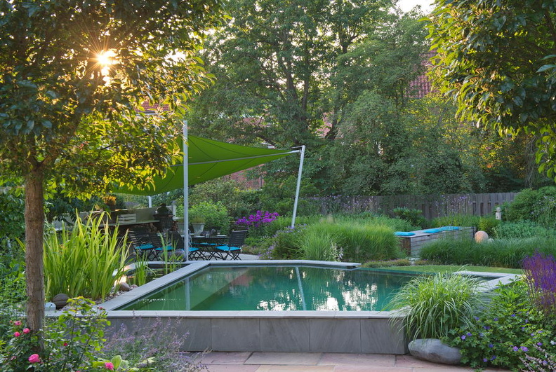 - Crataegus x lavallei 'Carrierei', Gartenküche, Pool, Rose 'Lavender Dream', Sonnensegel, modern, Naturpool