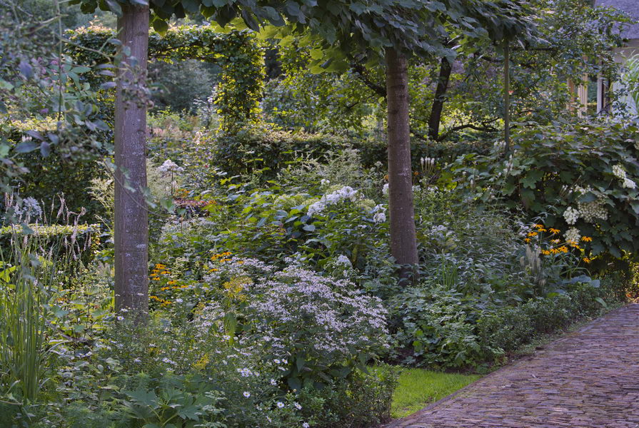 - Astern, Hydrangea arborescens, Hydrangea quercifolia, Linde, Lindenspalier, Pennisetum, Phlox, Rudbeckia, weißer Garten