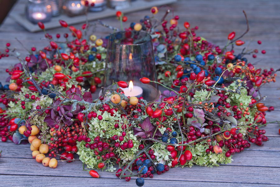 - Beeren, DIY, Hagebutten, Herbst, Kranz, Kranz binden, Zierapfel, Weißdorn, Hortensie