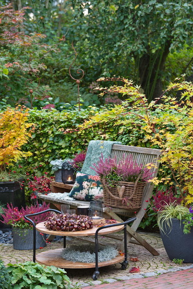 - Bank, Calluna, Herbst, Kissen, Sitzplatz, Terrasse, Acer palmatum 'Sangokaku'