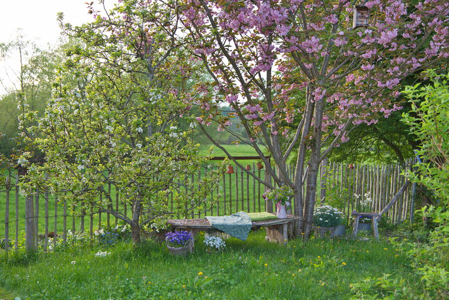 - Bank, Birne, Birnenbaum, Prunus serrula 'Kanzan', Zaun, Zierkirsche