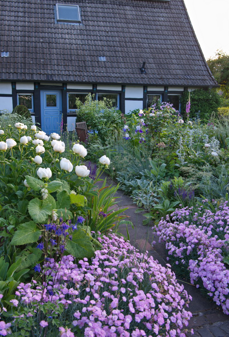 - Dianthus, Paeonia lactiflora 'Jan van Leeuwen', Stachys, Salvia sclarea