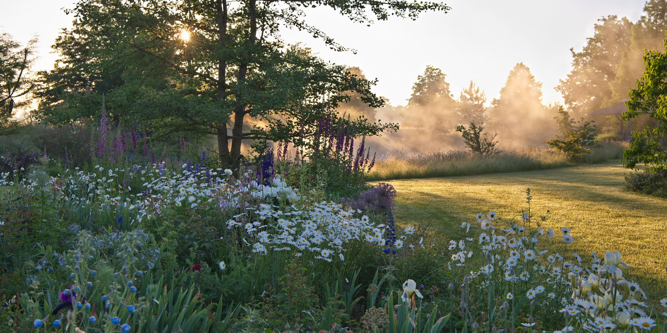 - Blumenwiese, Delphinium, Digitalis, Ginkgo, Leucanthemum, Margerite, Nebel, Paeonia lactiflora 'Jan van Leeuwen', Panorama, Rittersporn