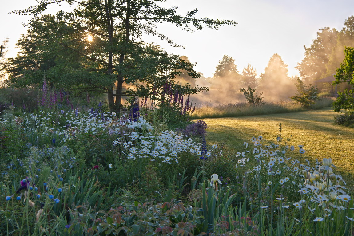 - Blumenwiese, Delphinium, Digitalis, Ginkgo, Leucanthemum, Margerite, Paeonia lactiflora 'Jan van Leeuwen', Rittersporn, Nebel