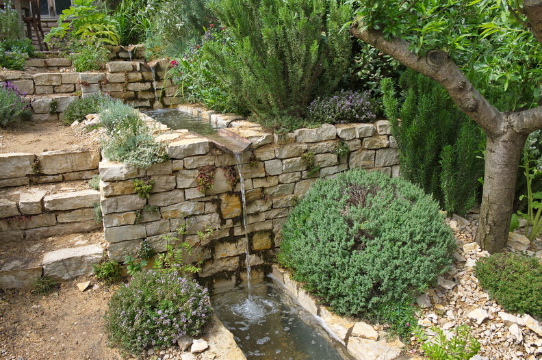 - Naturstein, Trockenmauer, mediterran, Wasser, Chelsea Flower Show