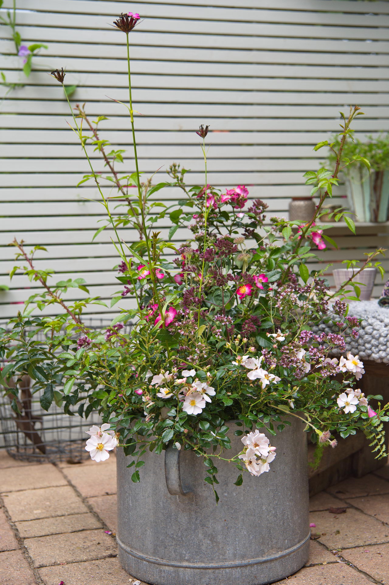 - Dost, Kartäuser-Nelke, Kleines Mädesüß, Rose 'Juanita', Rose 'Medeo'