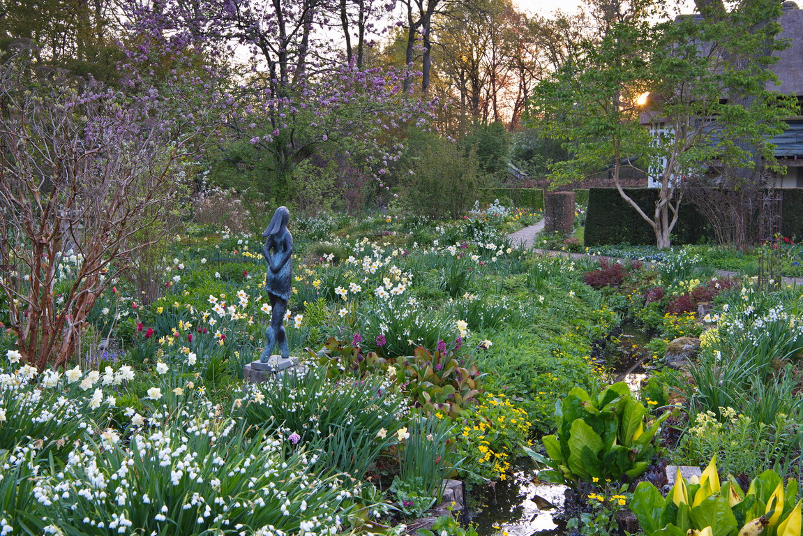 - Apfelbaum, Bach, Bergenia, Caltha palustris, Heptacodium miconioides, Leucojum aestivum, Lysichiton americanus, Malus, Narzissen, Primula veris, Skulprtur, Sumpfdotterblume