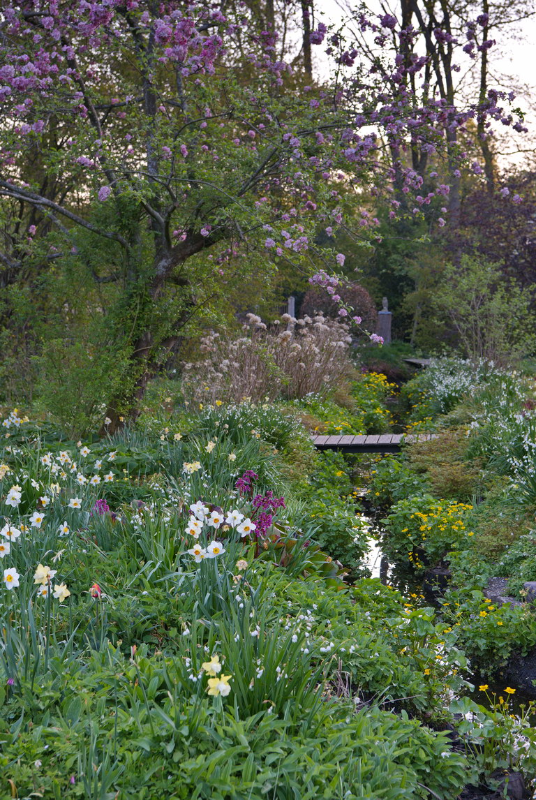 - Bach, Bergenia, Caltha palustris, Leucojum aestivum, Narzissen, Steg, Sumpfdotterblume