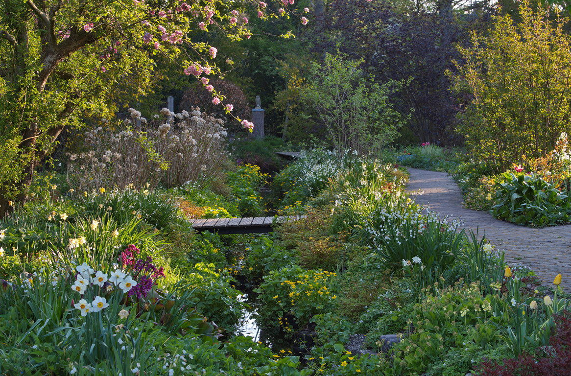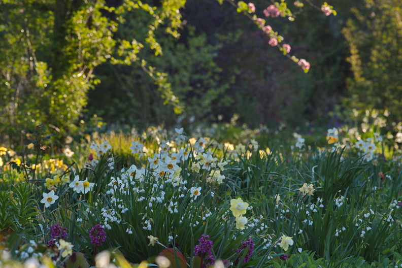 - Bach, Caltha palustris, Leucojum aestivum, Narzissen, Primula veris, Steg, Sumpfdotterblume