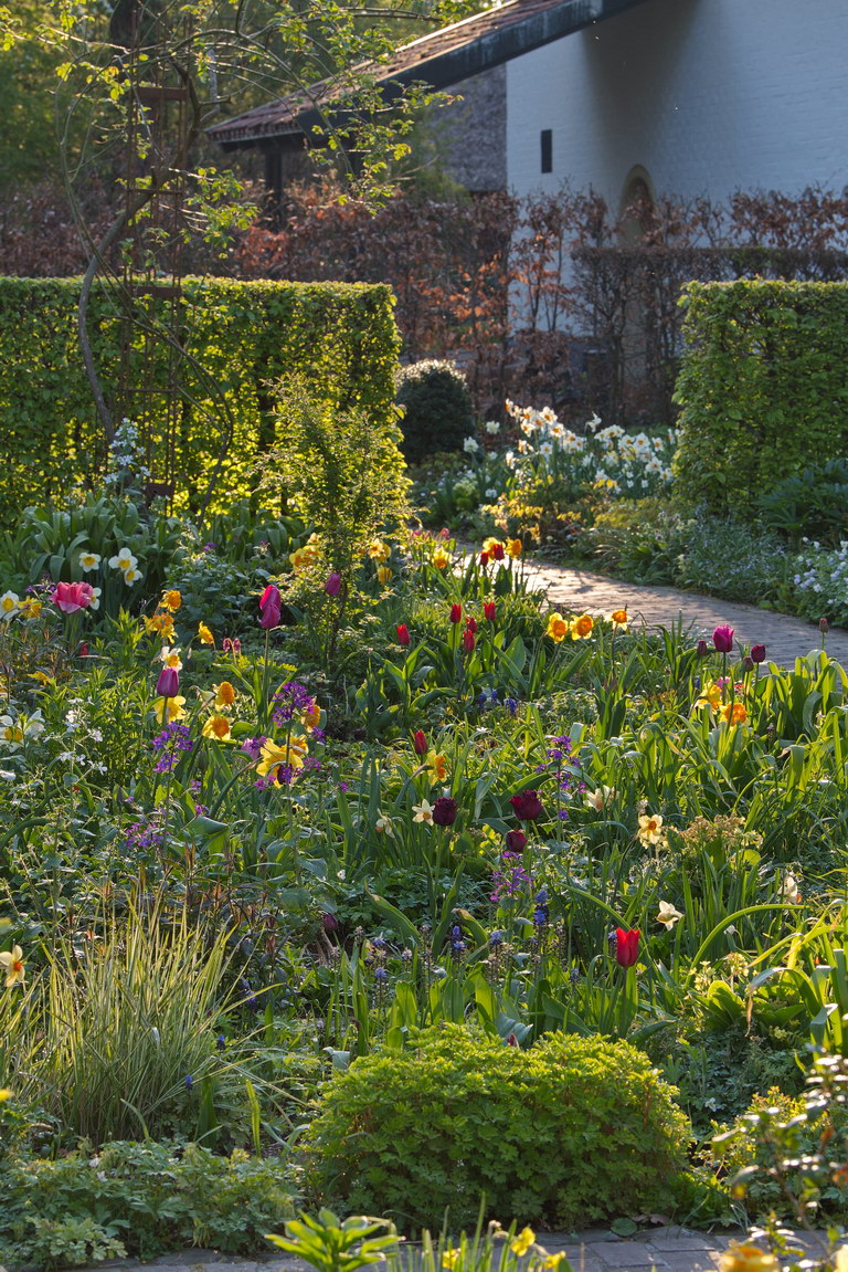 Hecke, Narzissen, Tulpen, Weg