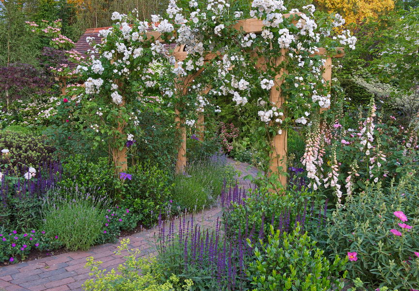 - Digitalis purpurea 'Sutton's Apricot', Nepeta racemosa 'Walker's Low'Salvia nemorosa 'Caradonna', Pittosporum tenuifolium 'Tom Thumb', Rosen, Pergloa