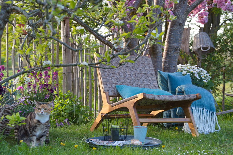 - Margarite, Prunus serrula 'Kanzan', Sitzplatz, Töpfe, Zierkirsche, Katze