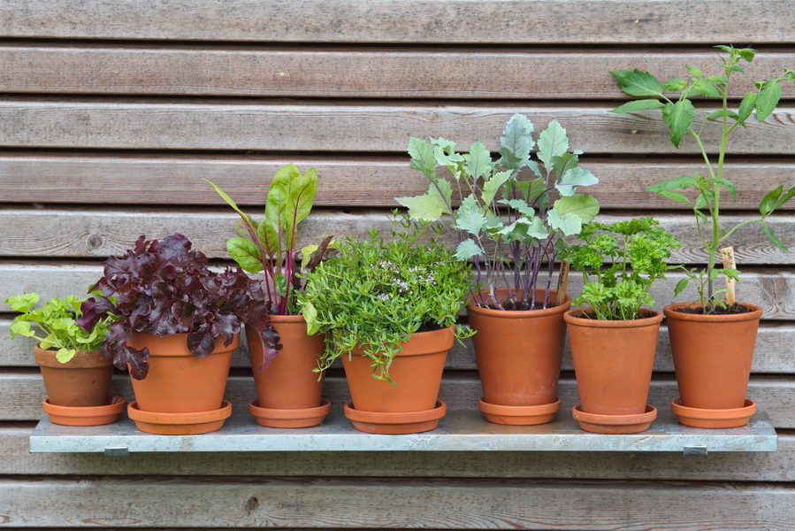 - Bohnenkraut, Jungpflanzen, Kohlrabi, Mangold, Petersilie, Regal, Salat, Tomate, Töpfe