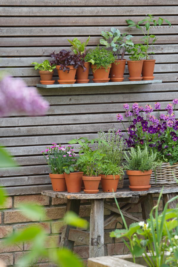- Bohnenkraut, Jungpflanzen, Kohlrabi, Mangold, Petersilie, Regal, Salat, Tomate, Töpfe