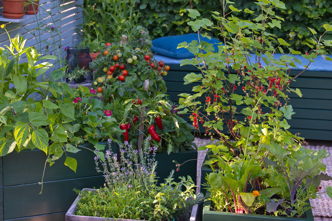 - Buschbohne 'Purple Teepee', Gemüse, Johannisbeere 'Jonkheer van Tets', Kissentruhe, Kübel, milde Chil, Tomate