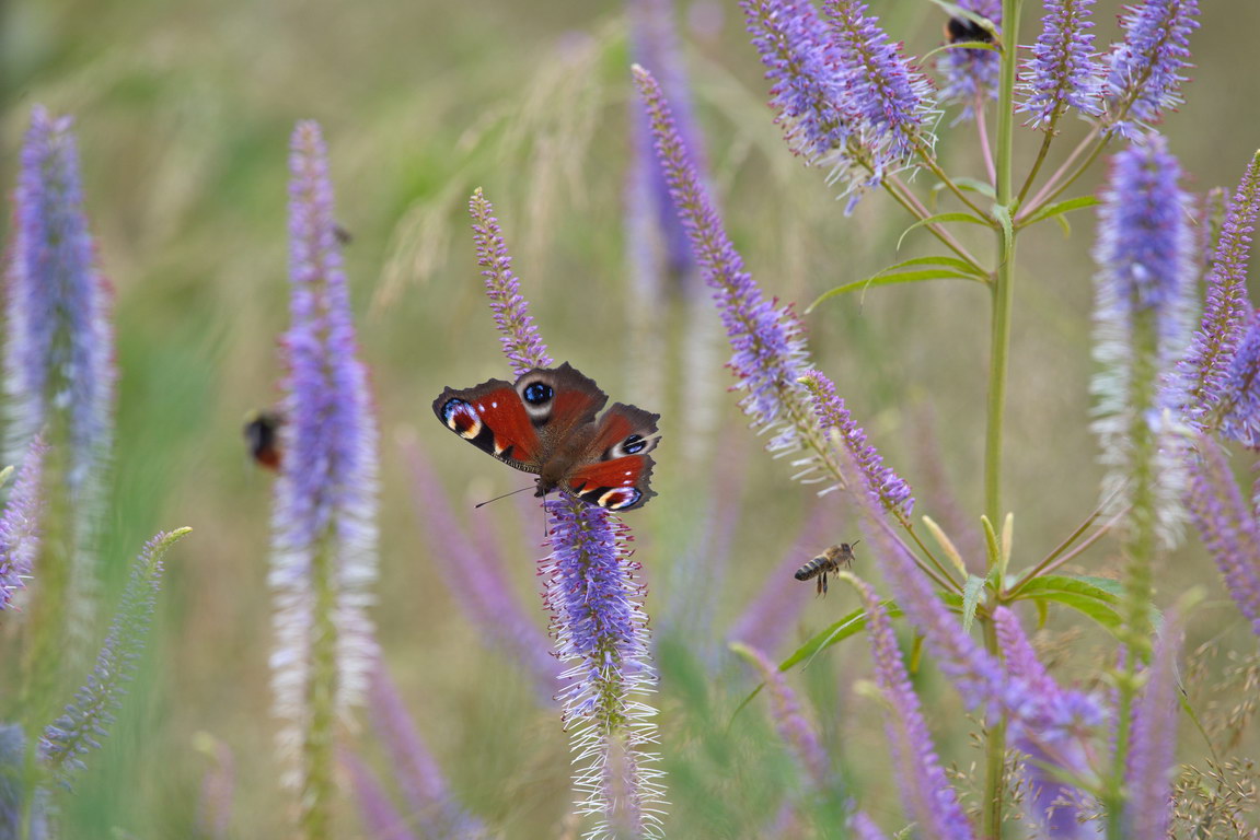 - Aglais io, Biene, Hummel, Präriebeet, Schmetterling, Tagpfauenauge, Veronicastrum