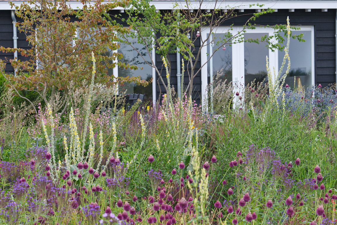 - Allium sphaerocephalon, Eryngium planum, Präriebeet, Verbascum