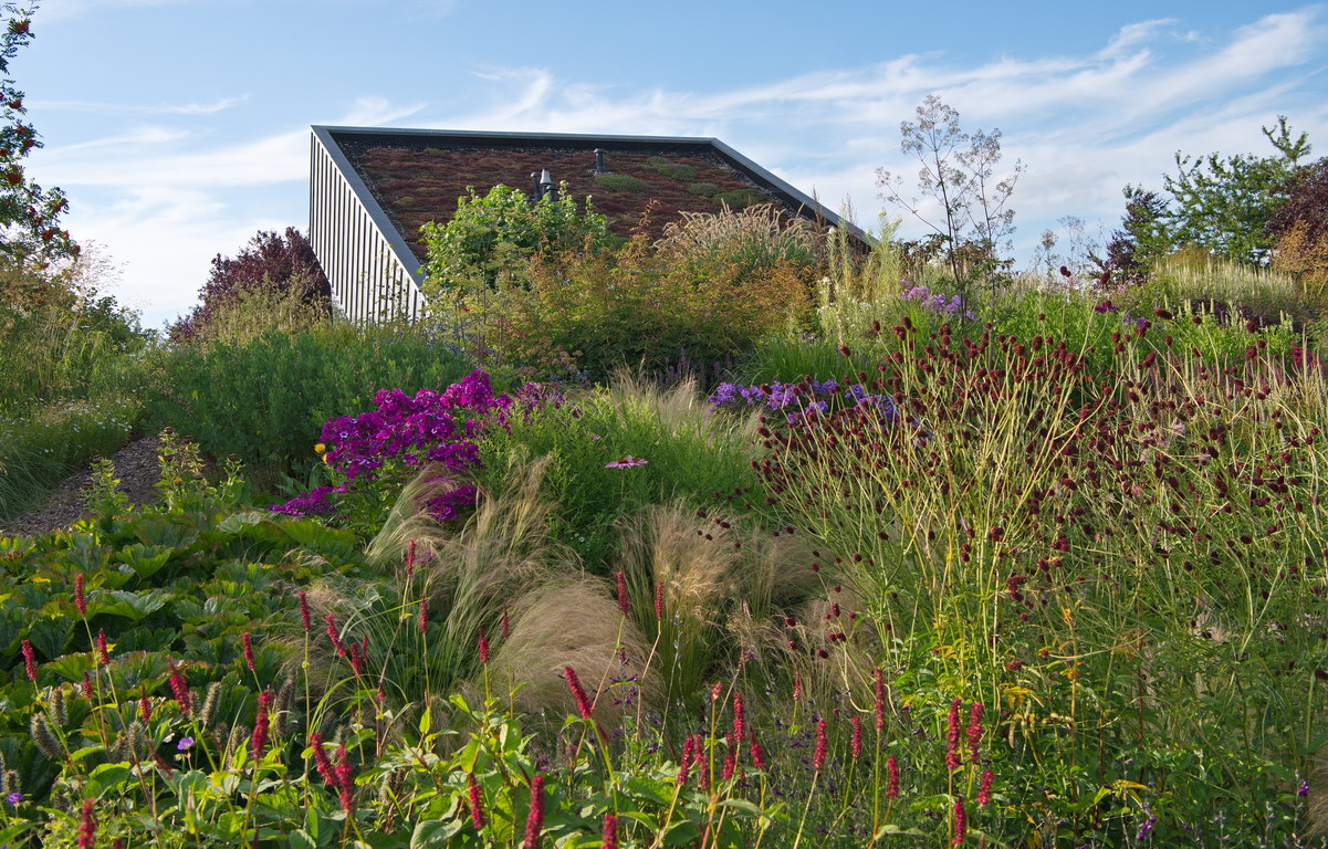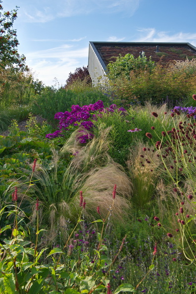 - Bistorta amplexicaulis, Dachbegrünung, Darmera peltata, Phlox paniculata, Präriegarten, Sanguisorba officinalis, Schildblatt, Stipa tenuissima