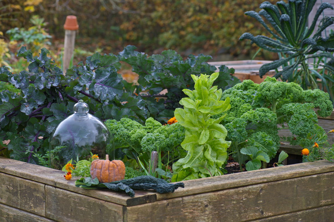 - Endivie, Flower Sprout, Gemüsegarten, Grünkohl, Hochbeet, Kürbis 'Mini Musk', Mischkultur, Palmkohl 'Nero di Toscana'