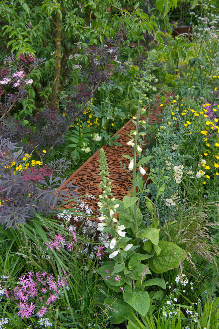 - Bank, Digitalis, Ranunculus acris, Silene flos-culi, kleiner Garten, Sambucus ‘Black Lace’