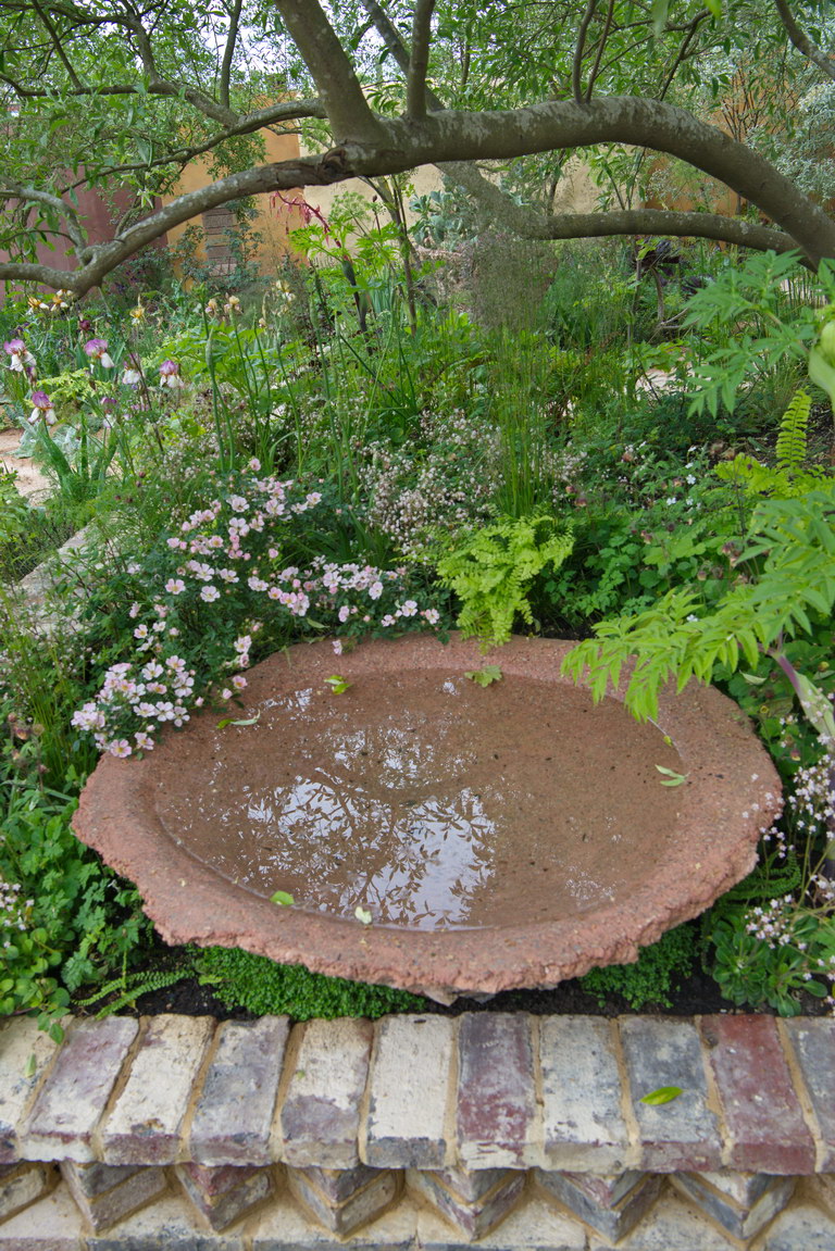 - Einfassung, Elaeagnus umbellata, Klinker, recycling, Saxifraga hirsuta, Wasserschale