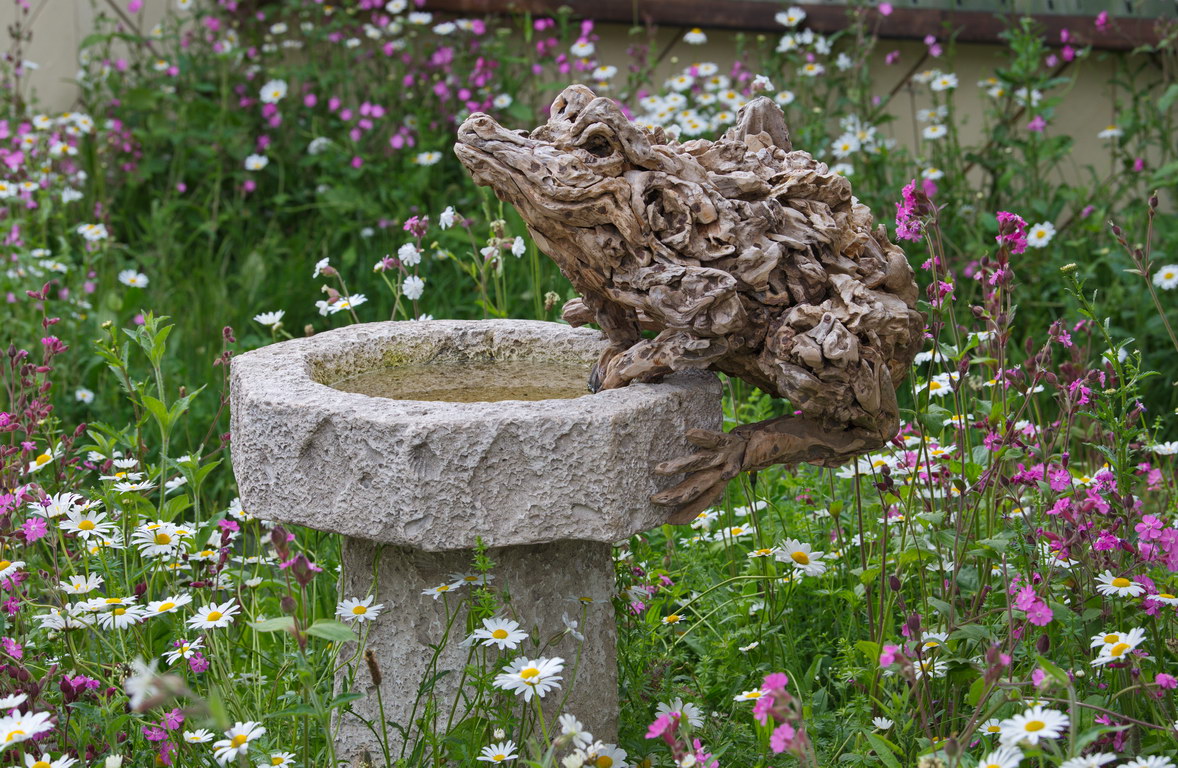 - Brunnen, Frosch, Leucanthemum vulgare, Silene, Skulprtur, Wildblumen