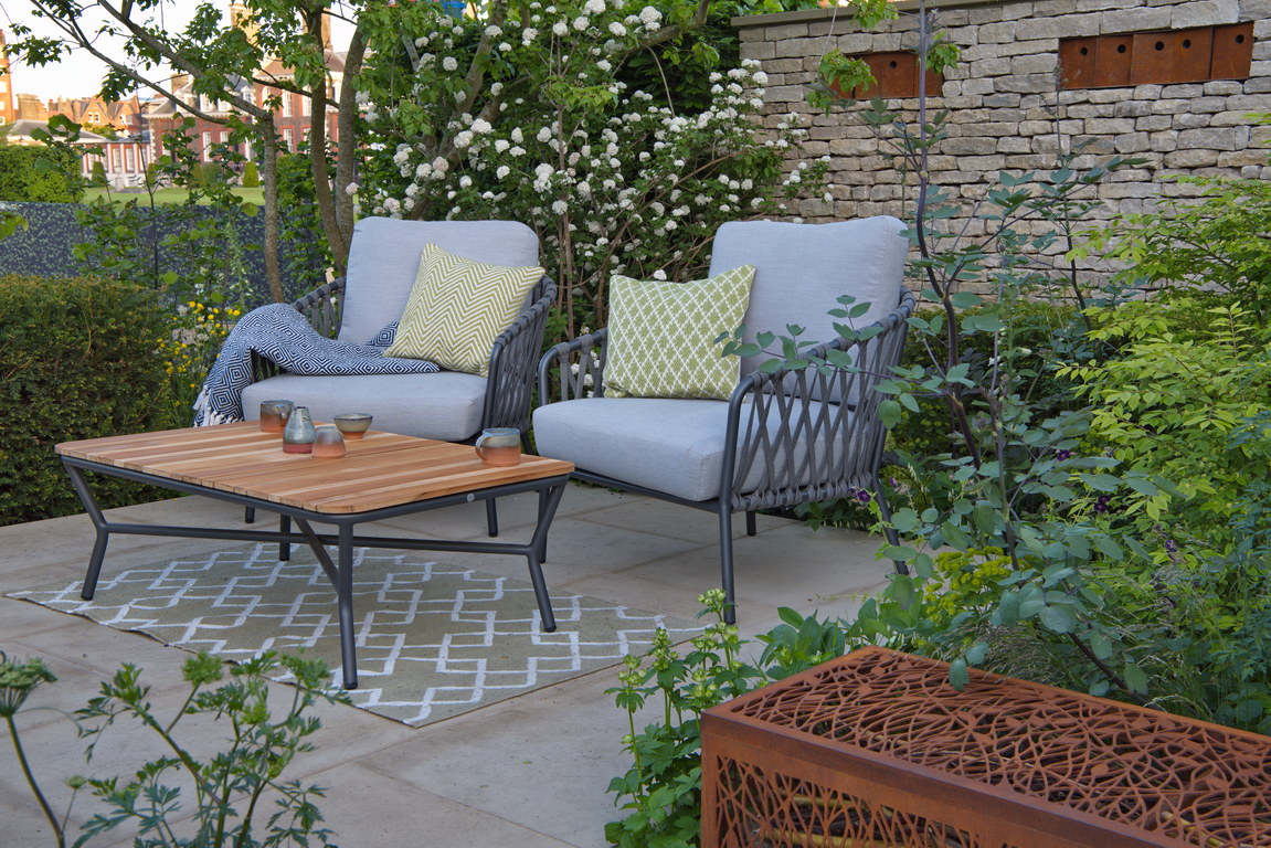 - Bank, Cortenstahl, Mauer, Sichtschutz, Sitzplatz, Terrasse, Viburnum opulus, kleiner Garten, Sandstein