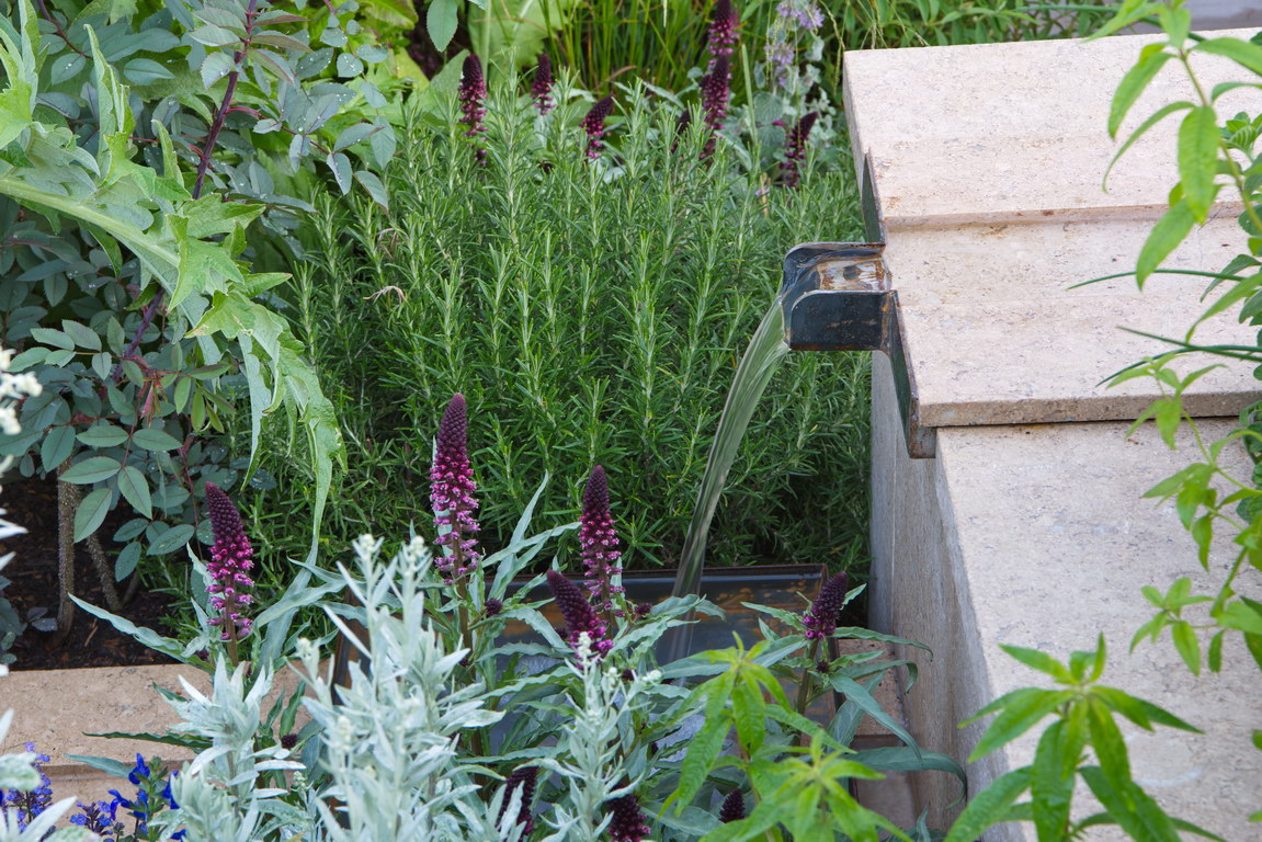 - Artemisia ludoviciana, Lysimachia atropurpurea, Rinne, Rosmarin, Wasser, Wasserauslauf, Wasserbecken, mediterran, kleiner Garten