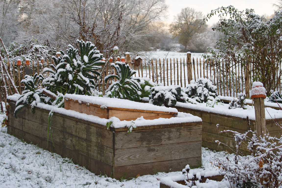 Hochbeet, Palmkohl, Schnee, Winter, Frühbeet