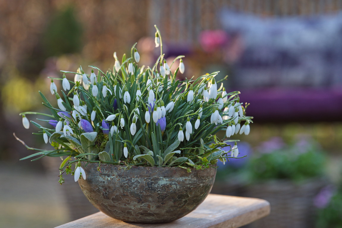- Crocus tommasinianus, Galanthus nivalis, Schale