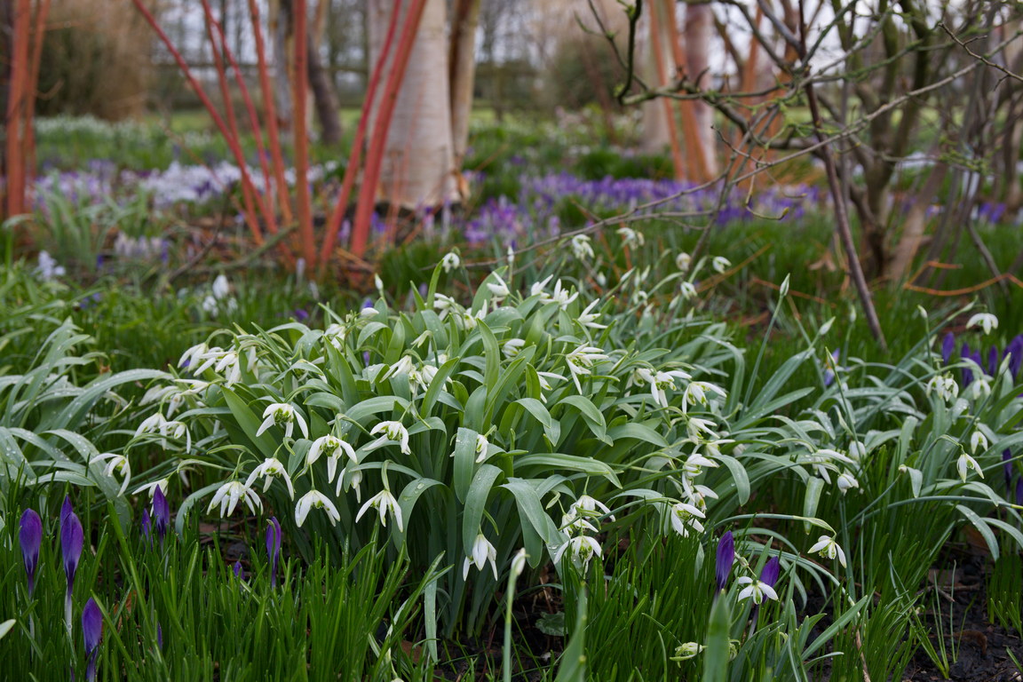 - Betula, Birke, Cornus sanguinea, Crocus tommasinianus, Elfen-Krokus, Galanthus, Galanthus 'Starling', Roter Hartriegel, Schneeglöckchen