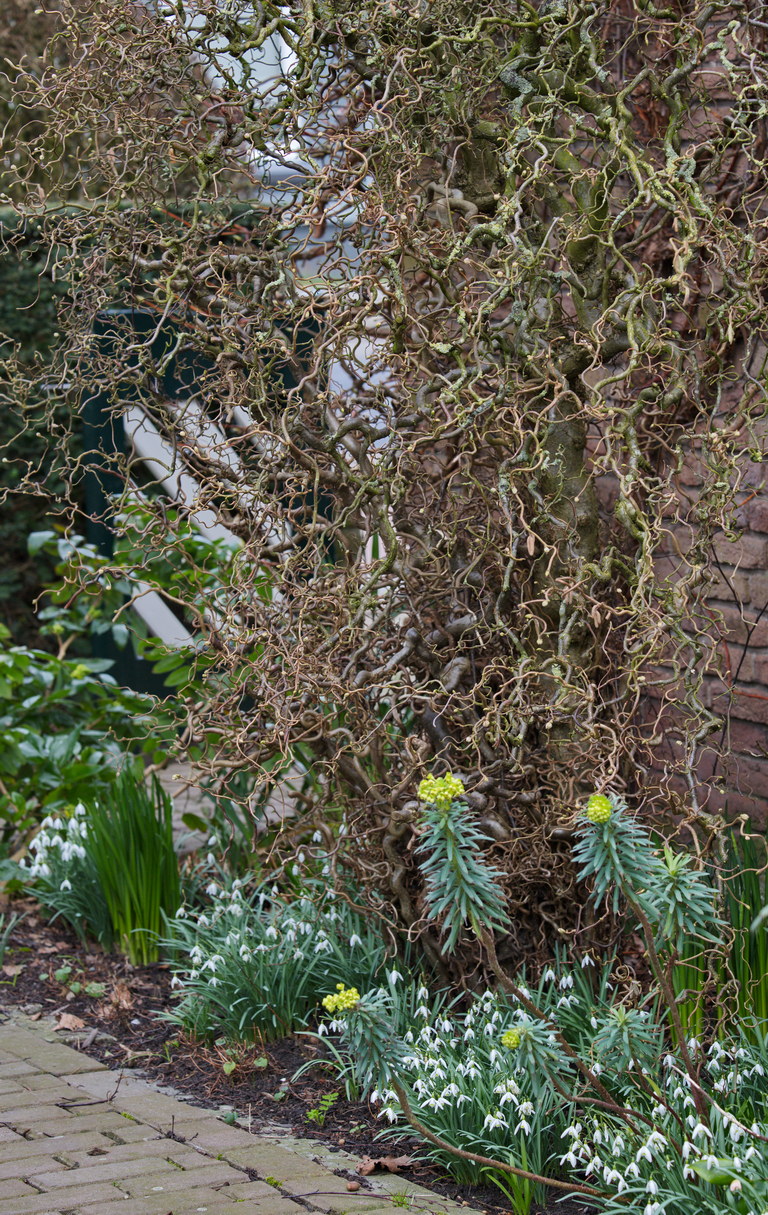 - Corylus avellana 'Contorta', Galanthus nivalis, Schneeglöckchen