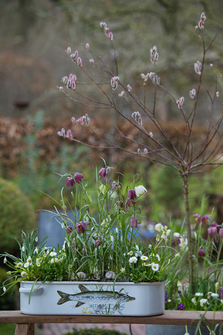 - alt, Bellis, Emailie, Fritillaria meleagris, Frühling, Kübel, Muscari, Narzissus, Salix gracilistyla 'Mount Aso', Schachbrettblume, Topf