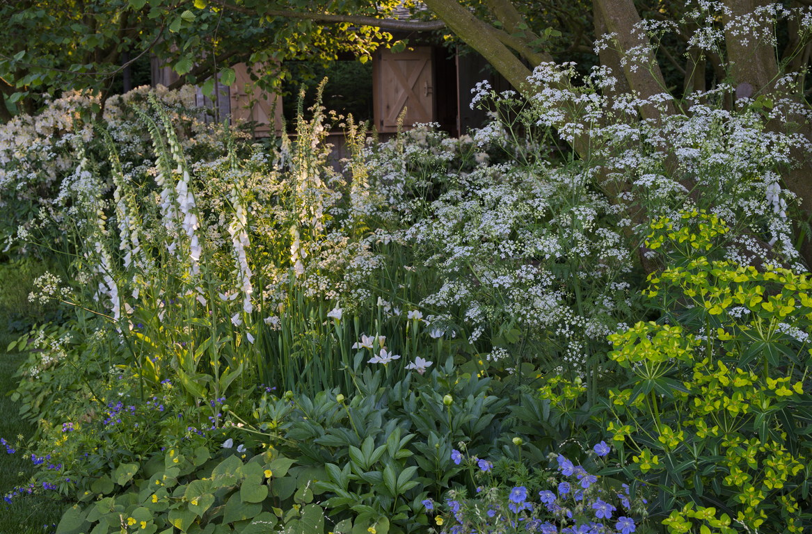 - Anthriscus sylvestris, Digitalis purpurea f. albiflora, Euphorbia schillingii, Geranium pratense 'Mrs Kendall Clark', Herzblattwurz, Iris sibirica 'White Swirl', Saruma henryi, Wiesen-Kerbel