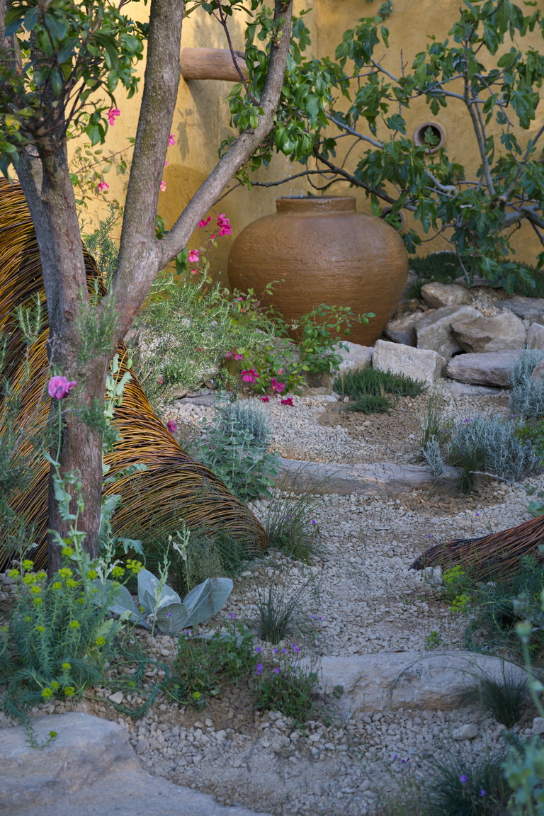 - Amphore, Brunnen, Feige, Ficus caria, Rose 'Mutabilis', mediterran, Weg, Splitt