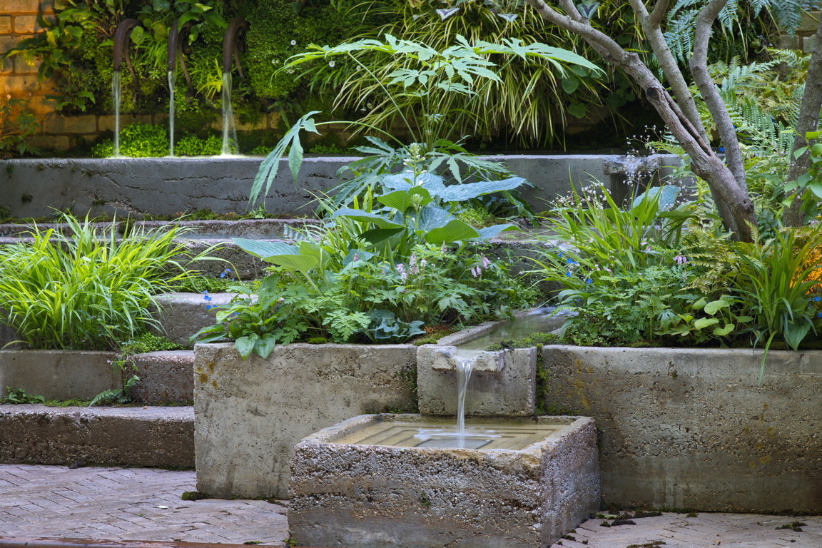 - Brunnera macrophylla, Dryopteris erythrosora, Fatsia polycarpa, Hakonechloa macra, Hosta, kleiner Garten, recycling, Schatten, Tiarella 'Spring Symphony', Wasserbecken, Wasserrinne