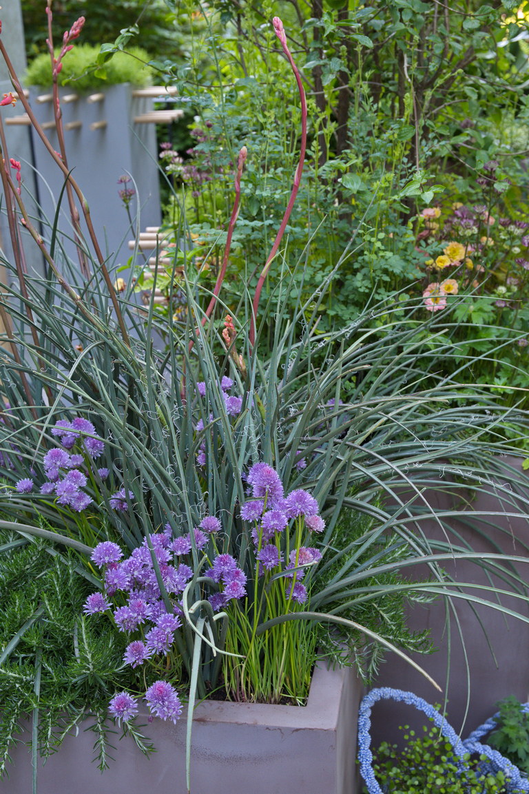 - Allium schoenoprassum, Hesperaloe parviflora, Kübel, Topfgarten