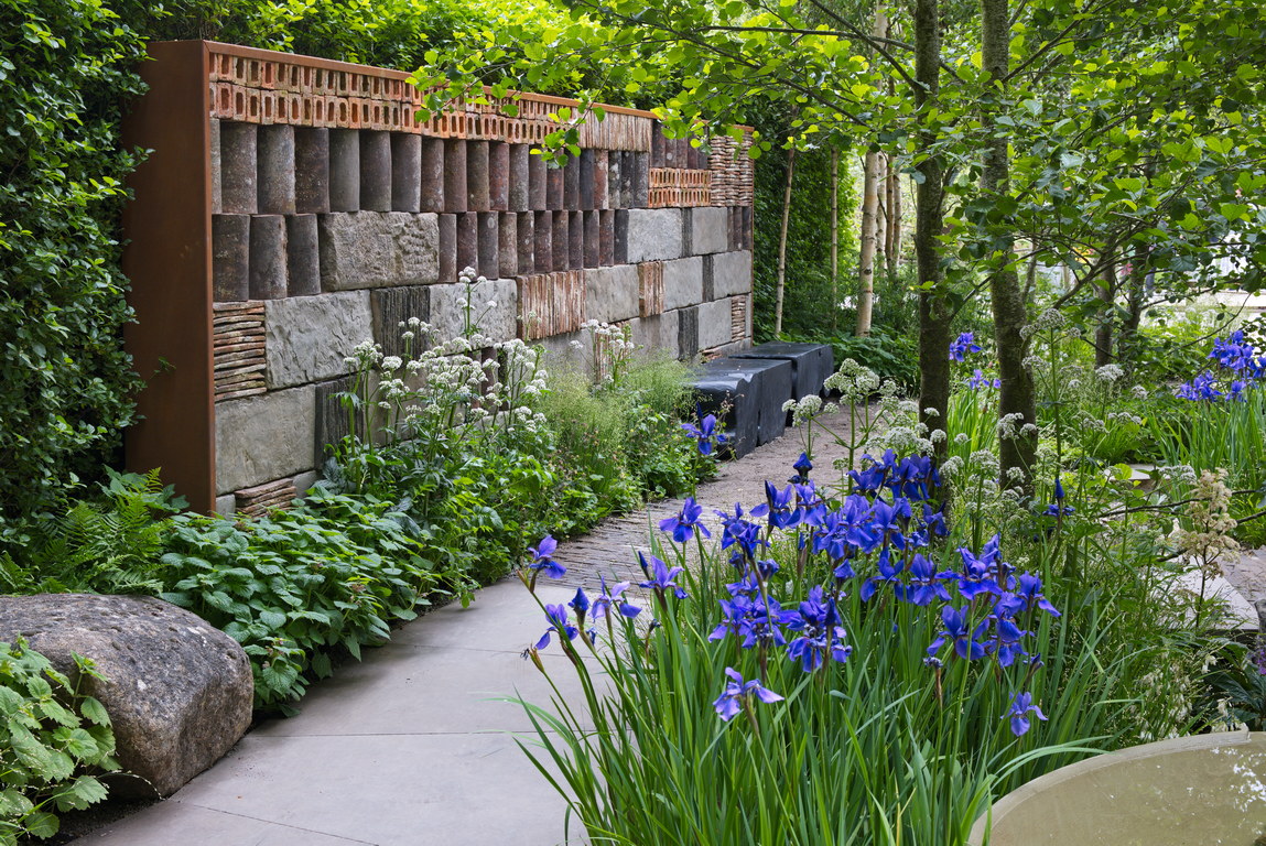 - Alnus glutinosa, Briza media, Iris sibirica 'Silver Edge', Mauer, recycling, Schwarzerle, Valeriana officinalis, Weg