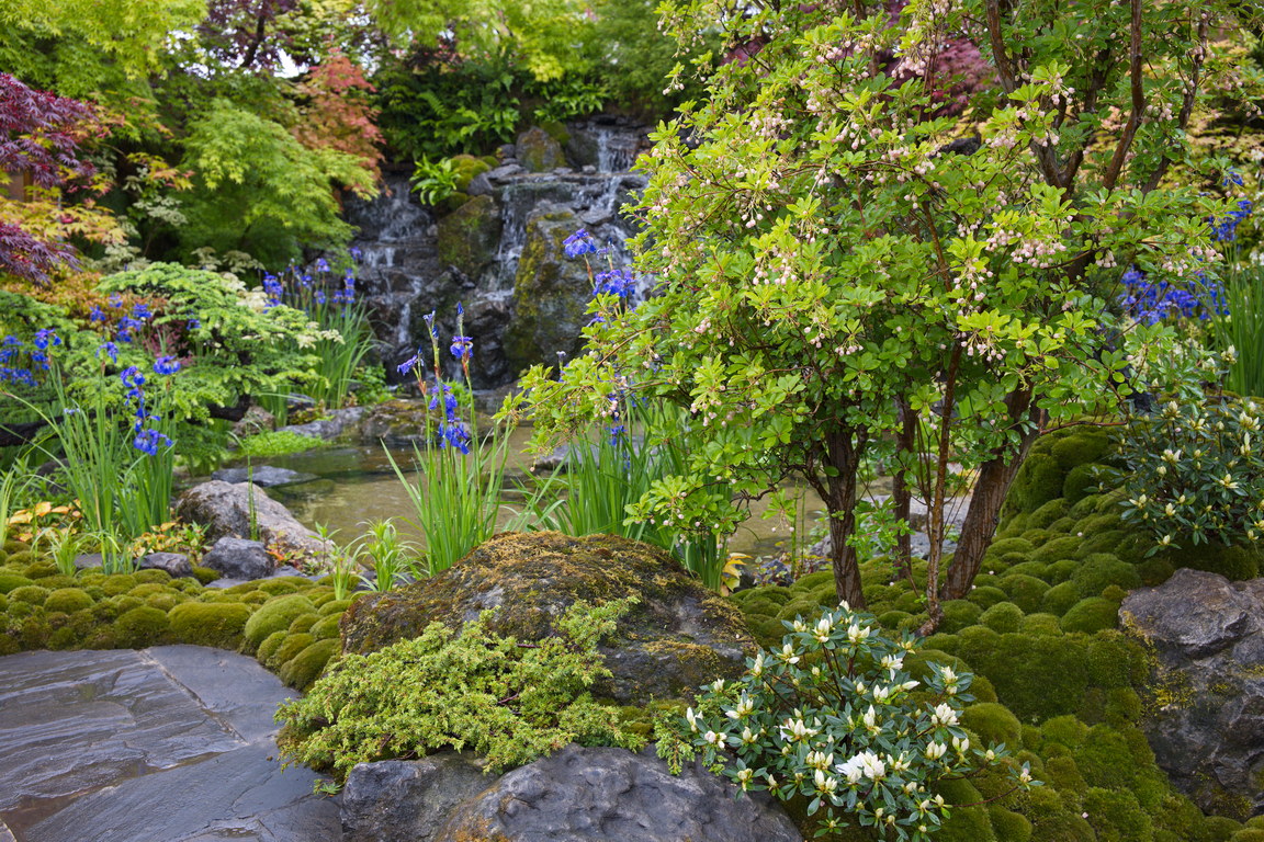 - Acer Yamamomiji, Acer palmatum Thunberg, Acer palmatum var. amoenum, Enkianthus, Houttuynia cordata, Iris sibirica 'Topic Night', Japanischer Garten, Pinus sylvestris, Prachtglocke, Wasserfall, asia, Moos, Leucobryum juniperoideum