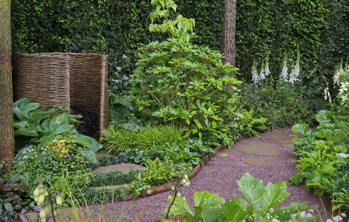 - Asarum europaeum, Blechnum spicant, Brunnera macrophylla 'Jack Frost', Digitalis, Komposter, Kompostplatz, Liriope muscari, Magnolia grandiflora, Weidengeflecht