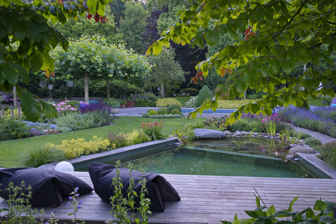 - Holzdeck, Natur-Pool, Naturpool, Platanus x hispanica, Pool, Schirmplantane