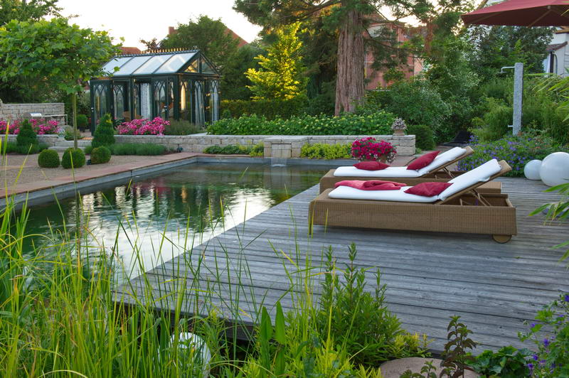 - Garten Zinsser, Gewächshaus, Holzdeck, Liegen, Schwimmteich