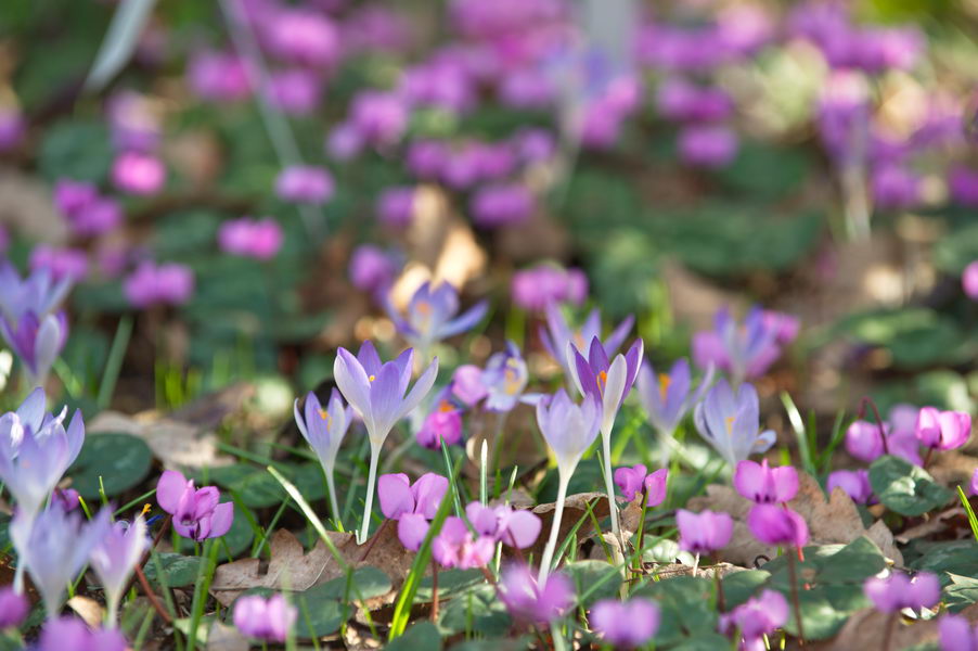 - Cyclamen coum,Crocus tommasinianus, Elfen-Krokus