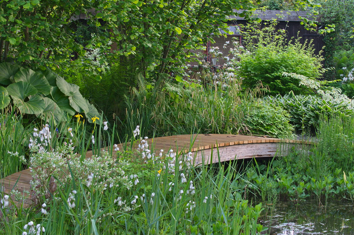 - Astilboides tabularis, Hosta, Iris pseudacorus, Steg, Teich, Wasser, Wollgras, Eriophorum angustifolium